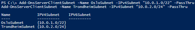 Add-DnsServerClientSubnet -Name TrondheimSubnet -IPv4Subnet "10.0.2.0/24" -PassThru