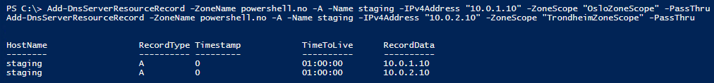 Add-DnsServerResourceRecord -ZoneName powershell.no -A -Name staging -IPv4Address "10.0.1.10" -ZoneScope "OsloZoneScope" -PassThru