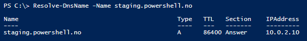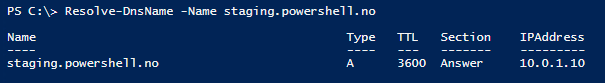 And then, we’ll use Resolve-DnsName from a computer in the Oslo subnet (10.0.1.0):