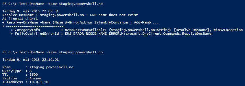 When running Test-DnsName before the allowed time of day we get an error stating that the DNS name does not exist, while after the allowed time of day the query returns the desired result: