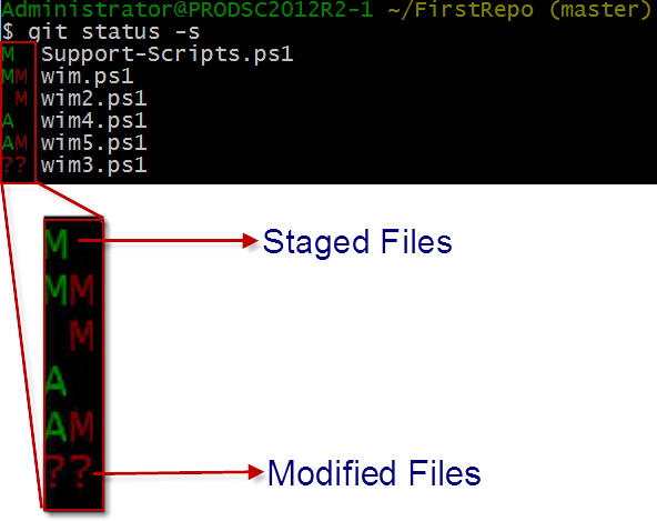 - The status MM next to wim.ps1 indicates that the already tracked file was modified and staged for next commit but was modified again.