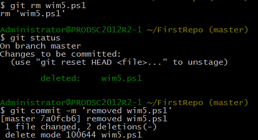 Just remember that the left column indicates files that are staged for next commit and the right column indicates files that are modified. As you start using Git more and more, looking at this short status and making sense of what’s going on in the repository becomes very easy. Finally, what if we want to stop tracking a file in the repository? Or in other words, how do we mark a file untracked and remove it from the commit snapshot? The git rm command is the answer. Note that using git rm, removes the file from disk too. If you don’t intend to remove the file from disk, use the –Cached switch with the git rm command. However, doing so will show the removed file as untracked in the git status output.