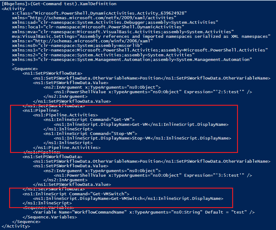 As you can see, the Get-VM | Stop-VM pipeline is broken up into 2 InlineScripts and the Get-VMSwitch into another one without us specifying this.