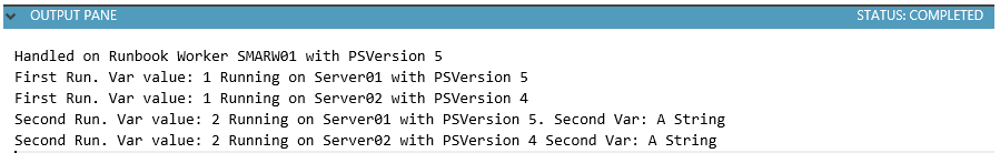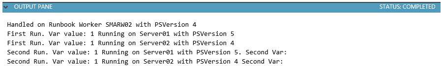 As you can see, the installation of WMF 5.0 would only need to occur on the runbook workers themselves for this bug to be resolved. This makes sense as the XAML is compiled here. When the runbook workers are updated, both WMF 4.0 and WMF 5.0 targets get the values passed correctly!