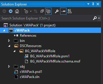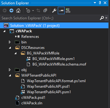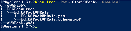Running this script will create a manifest module called cWAPack. Inside the module, a DSC resource BG_WAPackVMRole with a friendly name of WAPackVMRole is created. The schema.mof file for this resource is generated as well.