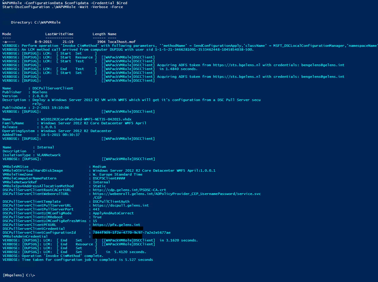 Some time ago I’ve written a blog series on Integrating Windows Azure Pack VM Roles with DSC Pull service. I’m going to use the resulting VM Role to demonstrate deployment of VM Roles using DSC where the resulting VM will be configured using DSC as well (the “Inception” effect). Also, I gave a presentation on the Dutch PowerShell User Group, where the deployment of the VM Role was partly backed by Service Management Automation. I did this so we could have one generic DSC Pull-enabled VM Role which could become any kind of service by making deployment time decisions on the SMA side of things (e.g. install sources to attach, extra disks to attach, keep VM Role under provisioning status while DSC was still running). I refer to this process, jokingly, as “Just in time automation”. You can read about it here. Finally, I would like to mention a blog post I’ve written on a way to “Bring your own DSC” as a way to implement the DSC VM Extension behavior with the somewhat limited Azure Pack VM Role capabilities.