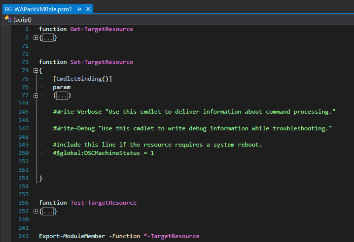Now it’s time to code up the BG_WAPackVMRole resource. Open it up by navigating in the solution project to DSCResources\BG_WAPackVMROle and double click BG_WAPackVMRole.psm1 which will open the file for editing.