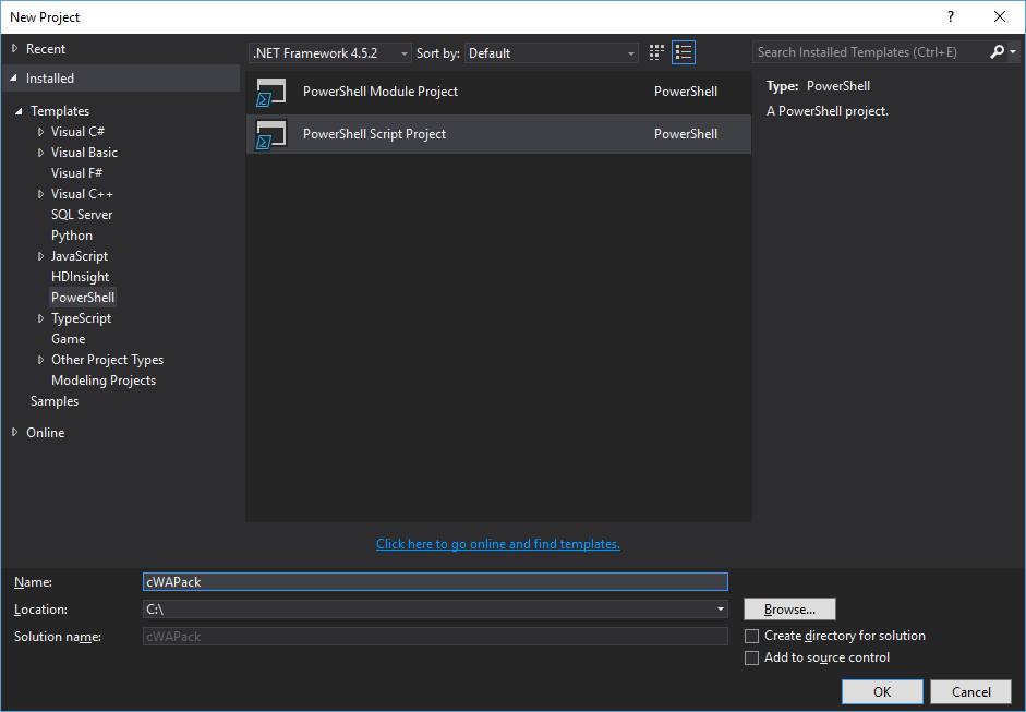 Make sure to specify the parent of the DSC module you created as the location. Deselect Create directory for solution and provide the name of the DSC module (cWAPack). Then hit OK.