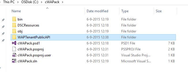 In this case I’m going to nest the module with the DSC resource module. To do this, copy the WAPTenantPublicAPI PowerShell module into the root of the cWAPack DSC resource module.