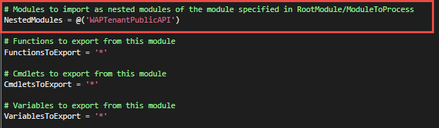 Now the module is included in the DSC resource module directory, we need to modify the DSC resource module manifest. We need to do this so we are assured when the DSC resource module is loaded by the Local Configuration Manager, the WAPTenantPublicAPI PowerShell module which is included with the DSC resource module is loaded as well. Open the cWAPack.psd1 file. Navigate to the NestedModules Key and uncomment it. Within the array, type WAPTenantPublicAPI and save the manifest.