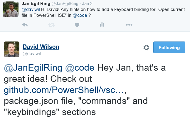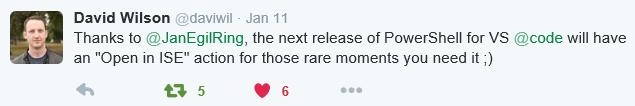Personally I find myself using Visual Studio Code more and more when working on larger PowerShell artifacts, such as repositories for PowerShell Desired State Configuration resources. It’s very fast and easy to use when you need a quick overview of a repository, as well as to make changes. When testing scripts still prefer to use PowerShell ISE, hence the request for an Open in ISE extension.