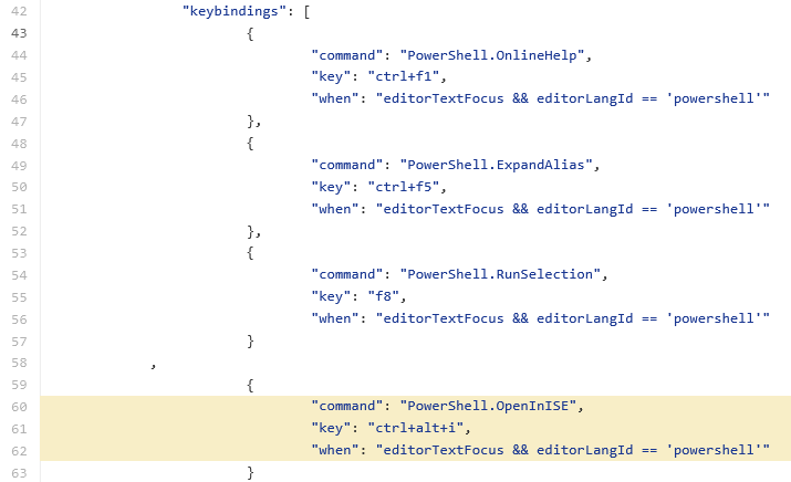 This is creating a so called key binding, so that the command PowerShell.OpenInIse is triggered when the editor is focusing on text and the current language ID is PowerShell (which is automatic when opening ps1/psd1/psm1-files).