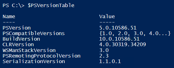 Until PowerShell 5.0 was released as part of Windows Management Framework 5.0, the build number was rounded to .0, such as 1.0, 2.0, 3.0, and 4.0. However, in this new and fast moving pace Microsoft have gotten into, we will see more frequent updates to PowerShell than before. Due to this, the PowerShell version number isn’t simply 5.0 anymore as you might have expected. Now it’s a full build number, such as 5.0.10586.117 for the RTM release of Windows Management Framework 5 for downlevel operating systems.