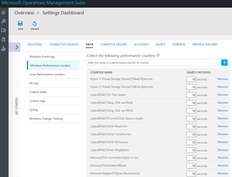 The heart of OMS is the Log Analytics feature, which makes it possible to interact with real-time and historical machine data. These data can be fed into OMS in several ways, but the most common is via the Microsoft Monitoring Agent. Among the data the agent can upload are Windows Event Logs and Windows Performance Counters, but this is something which can be customized in the Data section of the Settings Dashboard: