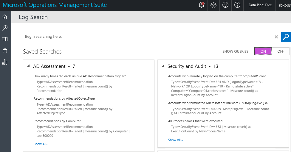 All data uploaded to OMS can be queried using a very powerful search language, not unlike similar products such as Splunk. When accessing the Log Search feature inside the OMS portal, a number of predefined saved searches can be found: