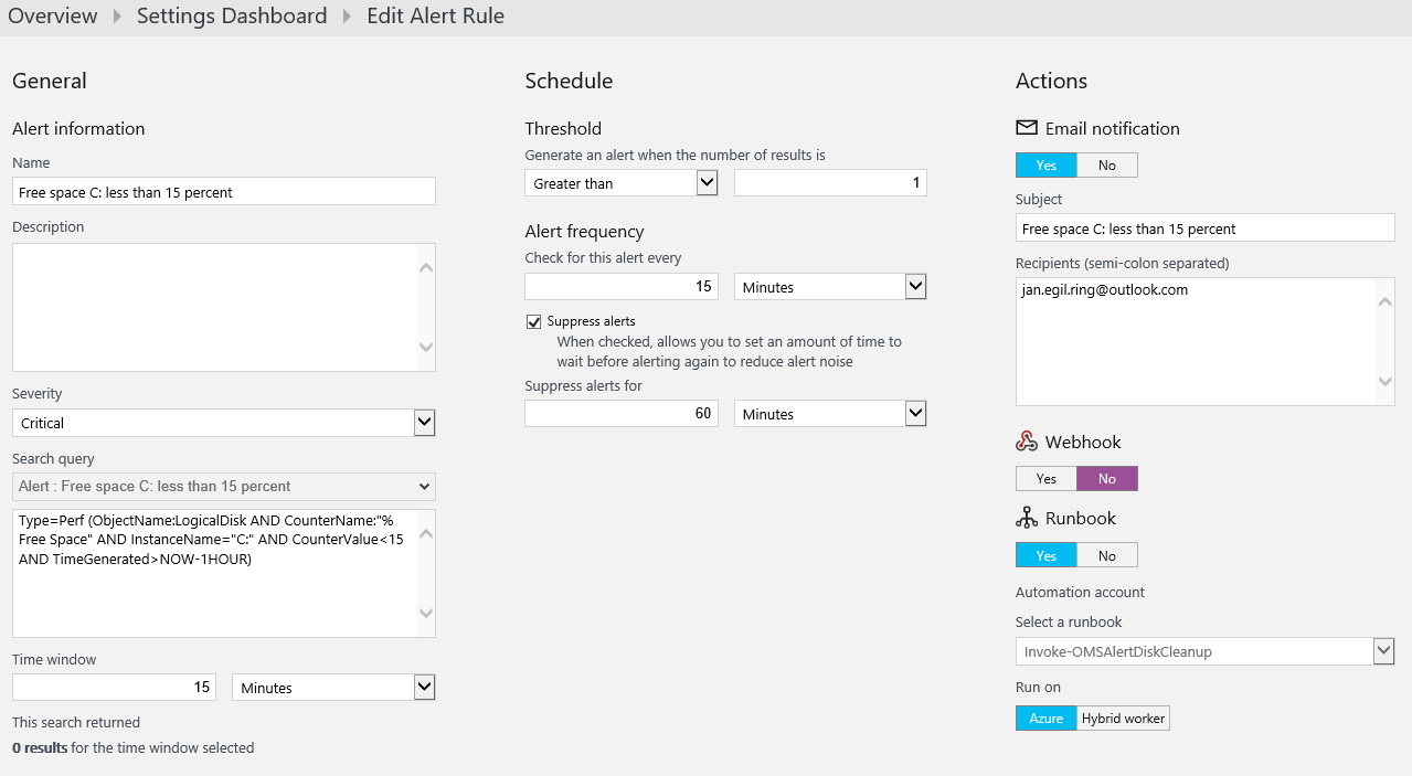 The interesting setting in our demo context is the Actions, and specifically the Runbook action. Select Yes, select the runbook you want the alert to trigger and choose whether to execute the runbook in Azure (a sandbox) or on a Hybrid Worker in your own environment. In our demo scenario we want the remediation runbook to take actions against the computers having low disk space, thus I chose to execute the runbook on a Hybrid Worker which do have access to my local network.