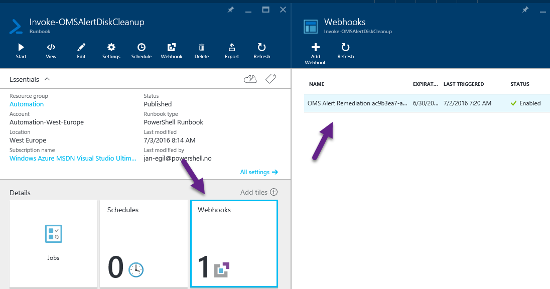 After saving the alert rule, we can see that a webhook has been automatically created on the specified runbook in Azure Automation: