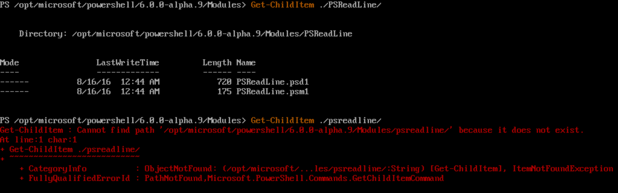 Another surprise is a result of presence of PSReadLine module. On Linux, iPSReadLine is using emacs mode by default (so certain key bindings are different than the one used on Windows, others have more Linux-like behavior). Both aliases and PSReadLine configuration can be adjusted using familiar technique – creating PowerShell profile: