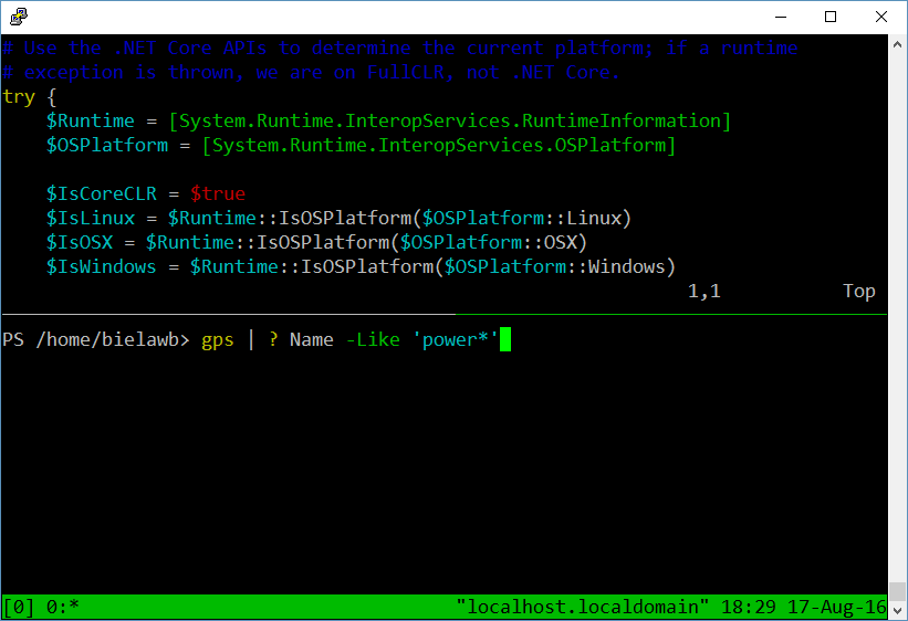 Language constructs work just fine, including configuration (requires PowerShell DSC for Linux to be installed on the same box) and classes. The only exception to this rule is PowerShell Workflow. We can test our code with Pester, we have PSReadLine to make our life easier. We can create instances of .NET Core classes and behavior is similar to the one we have on Windows.