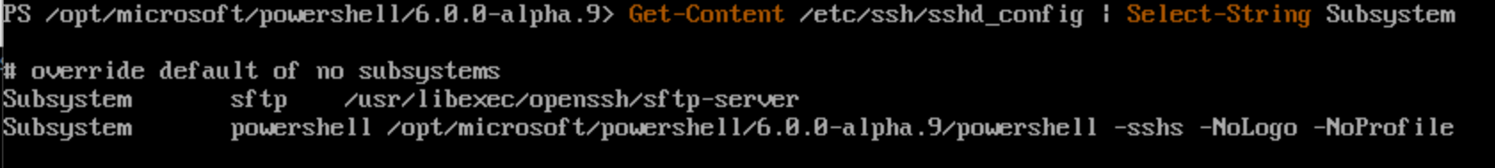 For Linux end we just need to be sure to install the SSH server Daemon (yum install -y openssh-server if not already installed) and client (yum install -y openssh-client. We should edit the /etc/ssh/sshd_config file to include PowerShell as a subsystem using your favorite text editing tool (e.g. vi, nano).