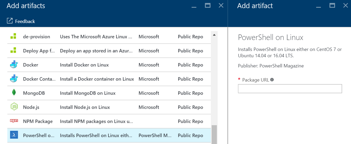 Once you select the PowerShell on Linux artifact, you will be prompted for the package URL.