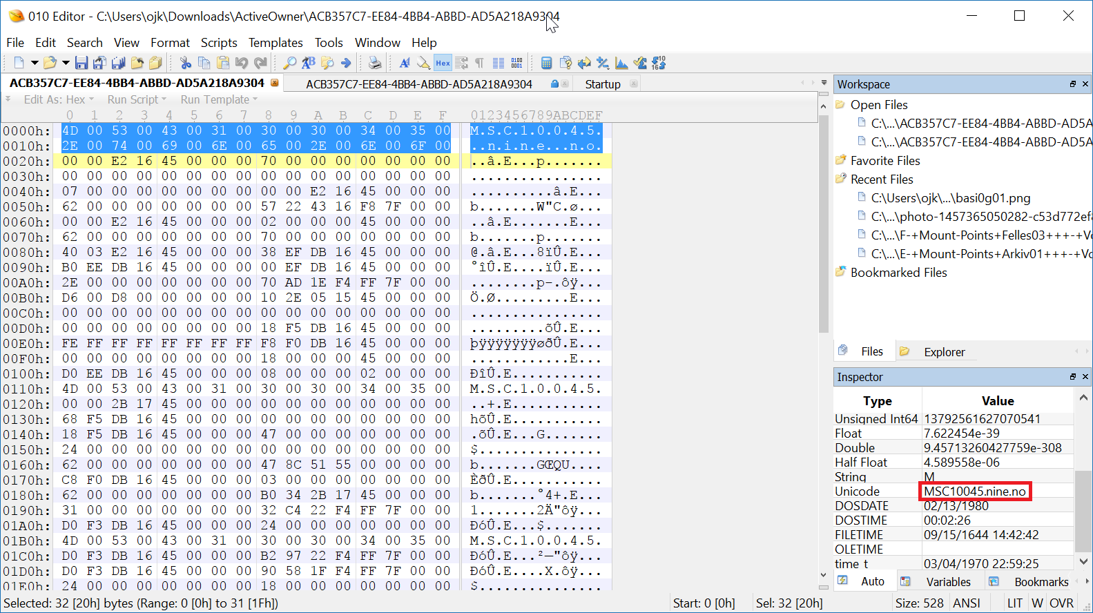 It’s useful to use a dedicated hex editor when working with binary file types. In the following screenshot, I’m using the 010 Editor, and as you can see the editor have confirmed our suspicion that the text is in Unicode format.