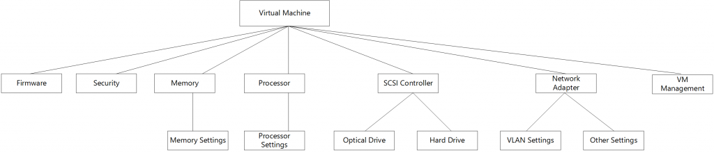 One of the things that I consider when starting out with developing a new resource module is to first understand the resource itself. Let us look at the VM example again. Here is how I would represent the VM and its related components in a hierarchical manner.