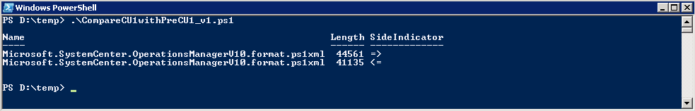 And again we are using the Compare-Object cmdlet to compare the content of the pre RU1 Microsoft.SystemCenter.OperationsManagerV10.format.ps1xml file with the post RU1 format file.
