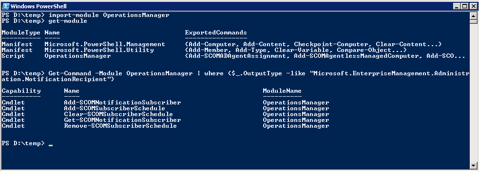 We can see formatting for the Microsoft.EnterpriseManagement.Administration.NotificationRecipient TypeName did not existed before RU1 was installed. To find the cmdlet(s) which has the Microsoft.EnterpriseManagement.Administration.NotificationRecipient is easy using the Get-Command cmdlet.