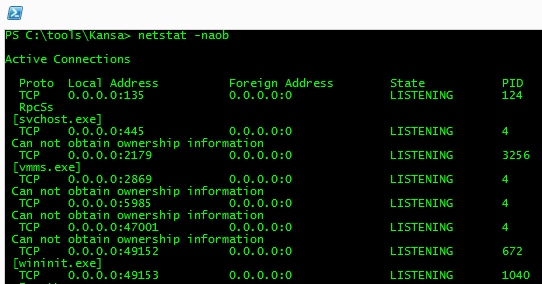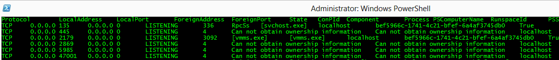 These should be largely self-explanatory, but let’s take a moment to look at Get-Netstat.ps1 in a little detail. As you may have guessed, this collector runs Netstat on each target, but it runs it with the -naob arguments. If you run this on your systems, your output may look something like the following: