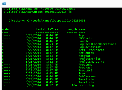 After Kansa finishes running, it will let you know if encountered any errors by telling you to look in the Errors.log file which will be in the Output directory. All Output directories are time stamped. Let’s take a look at the one that was just created as part of the sample run above: