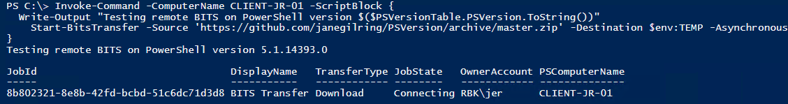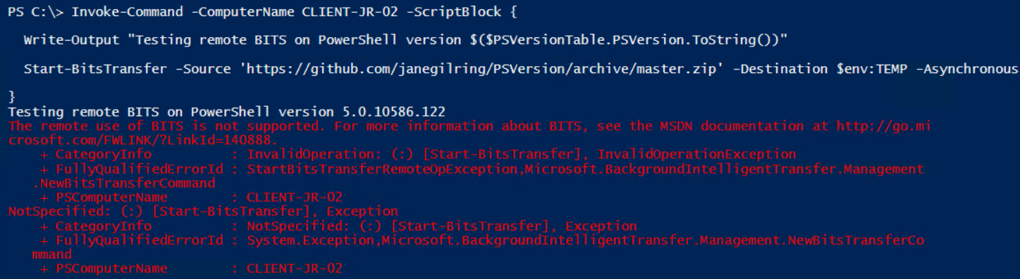 Previously, using cmdlets in the BITS module was not supported when invoked via PowerShell remoting. Let’s verify this on Windows 10 build 1511: