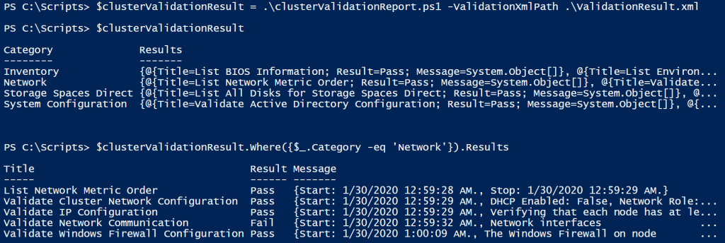 Behind the scenes, the Test-Cluster command generates an XML every time it was run. This XML gets stored at C:\Windows\Temp. Looking at the XML you can easily notice that the schema was really designed to generate the HTML easily. So, it took a few minutes to understand how the tests are categorized and come up with the below script.
